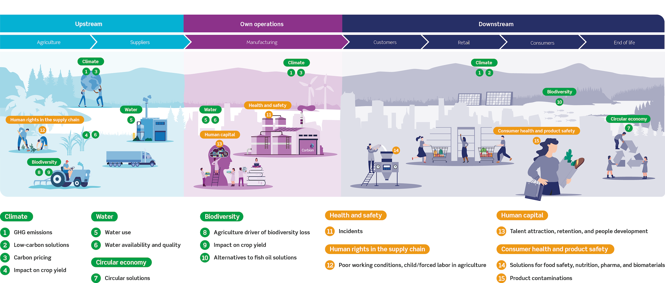 Corbion uses the double materiality assessment (DMA) to hear the voices of our stakeholders and identify material impacts, risks, and opportunities. The assessment informs our sustainability strategy, business planning, and risk management, as well as the content of our Annual Report.
